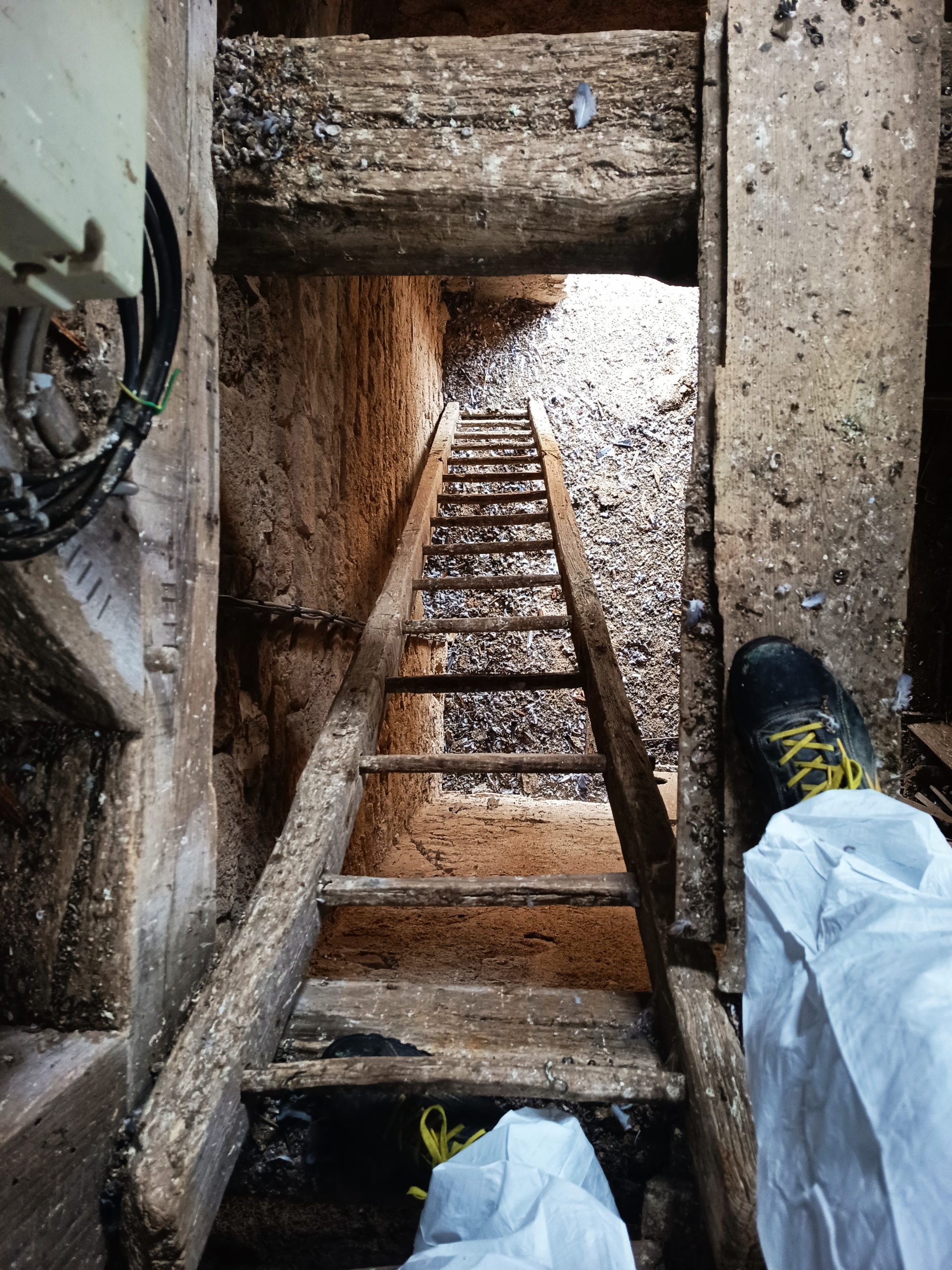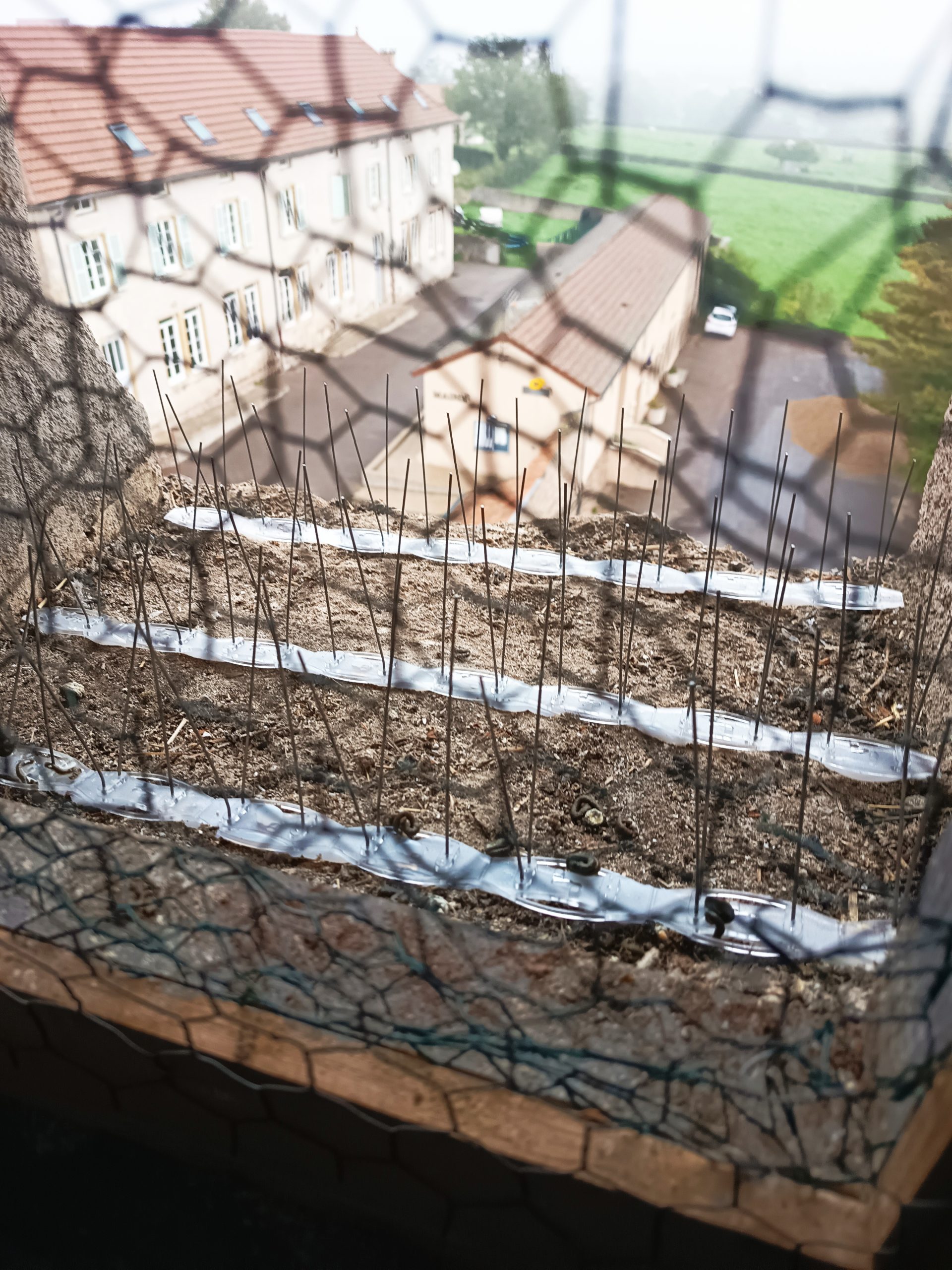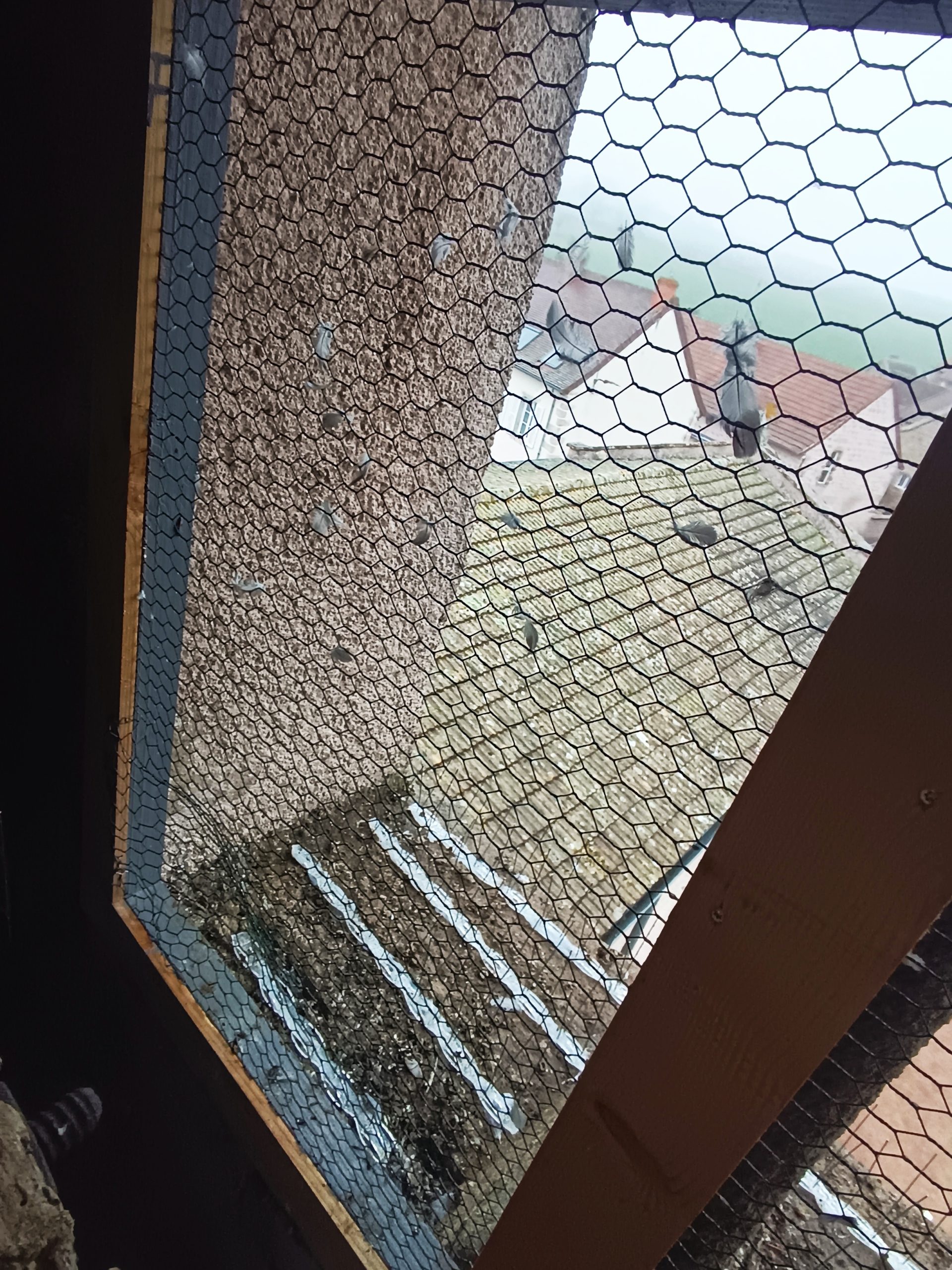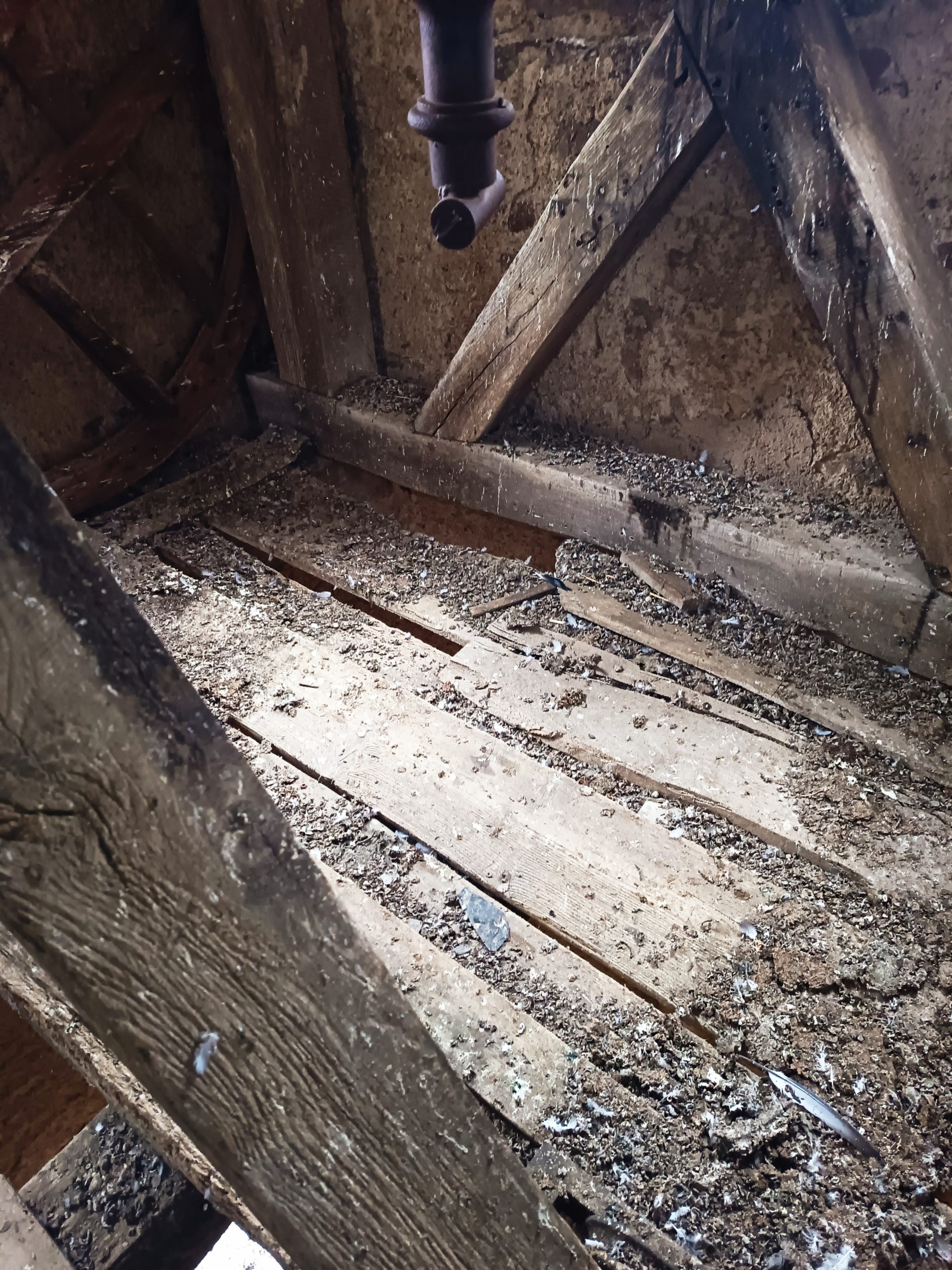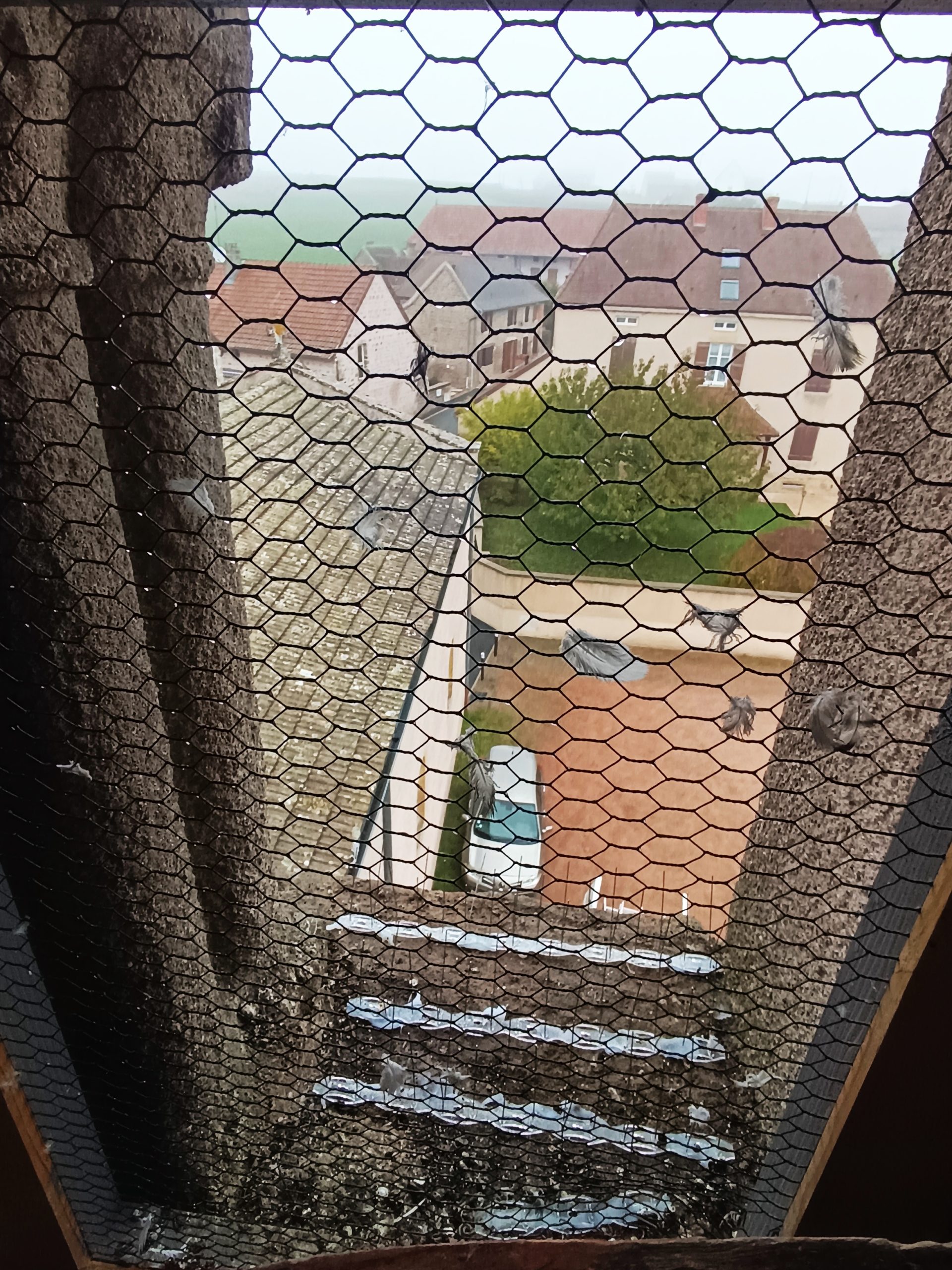 Vos professionnels de la désinfection ont effectué le brossage à la brosse métallique des fientes de pigeon sur la cloche et escaliers, l'enlèvement et l'évacuation de toutes les fientes dans la tour de l'église + un traitement bactéricide par nébulisation puis un dépigeonnage avec mise en place de pics à pigeons sur les rebords de fenêtre et pose de filets anti volatiles au niveau des fenêtres de la tour.