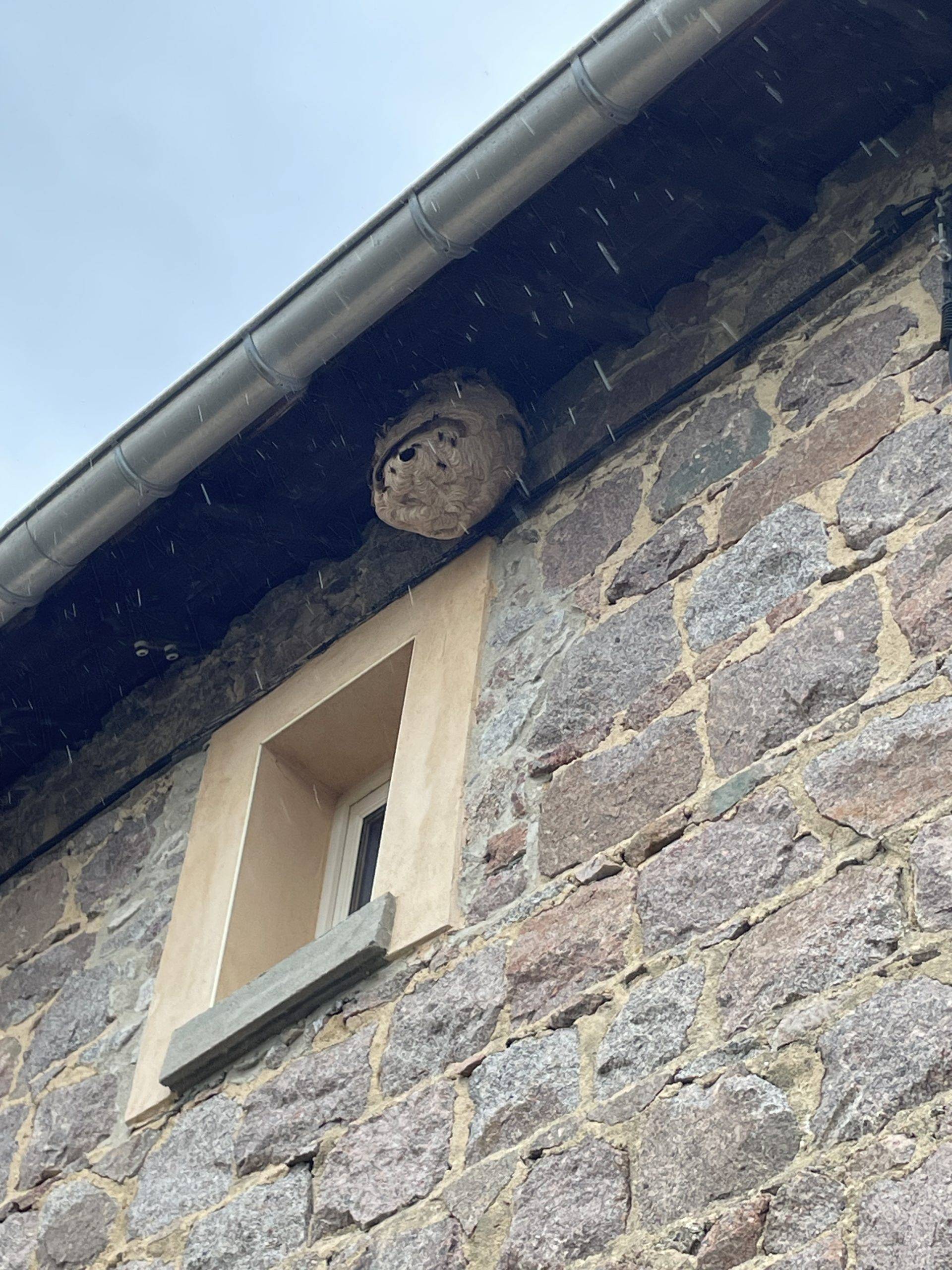JPM 3D a effectué une désinsectisation d'un nid de frelons asiatiques par poudrage insecticide situé sous une avancée de toiture à l'aide d'une grande canne télescopique allant jusqu'à 15m, l'enlèvement + la destruction du nid à St Etienne des Oullières dans le Rhône (69).