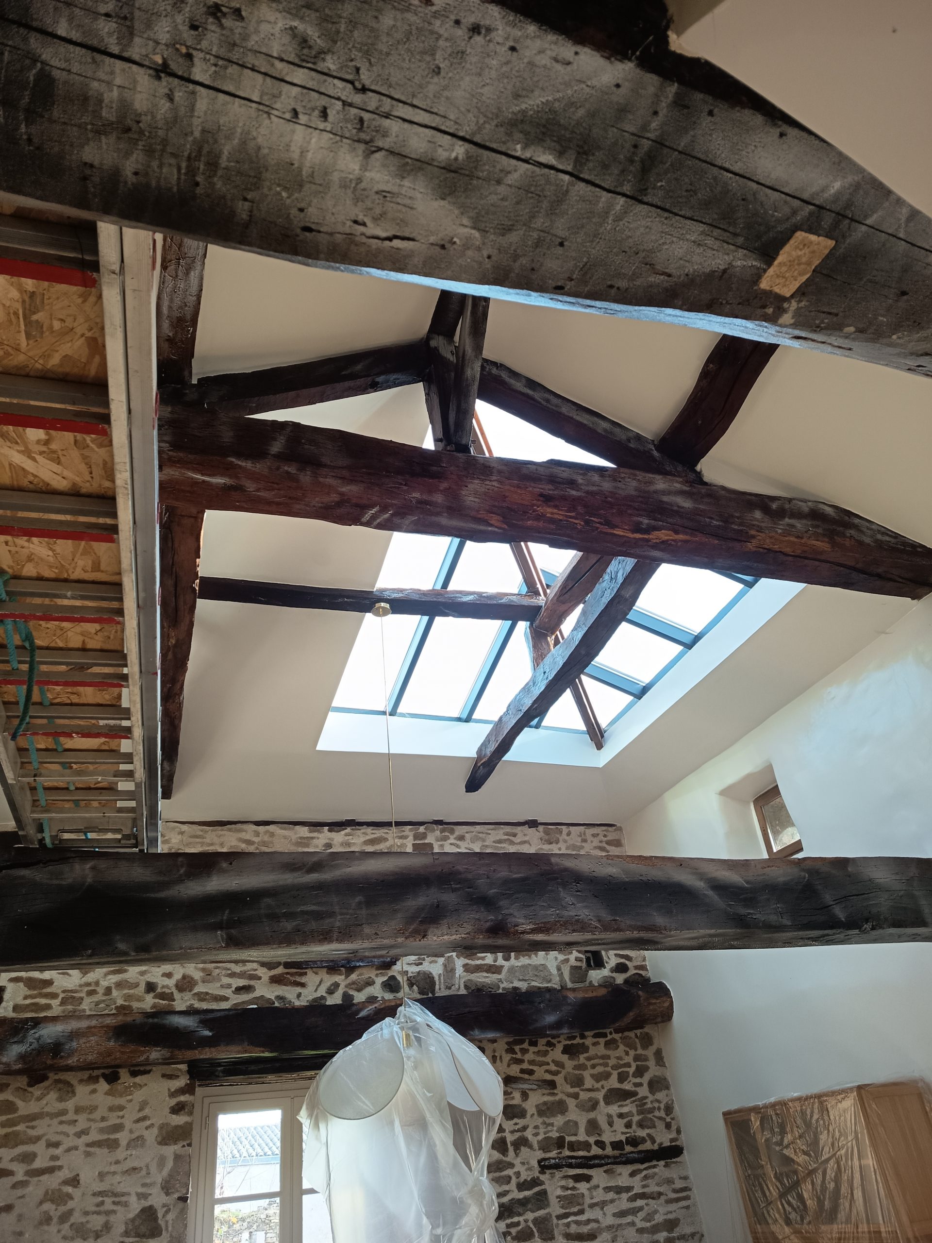 Vos professionnels du traitement de bois ont effectué la mise en place de bâche polyane pour la protection des sols, un léger décapage sur les parties de bois les plus infestés puis un dépoussiérage de l'ensemble de la charpente, le perçage des pannes et fermes, la mise en place d'injecteurs, et le traitement par injection et par imprégnation totale des bois au Xilix Gel insecticide.