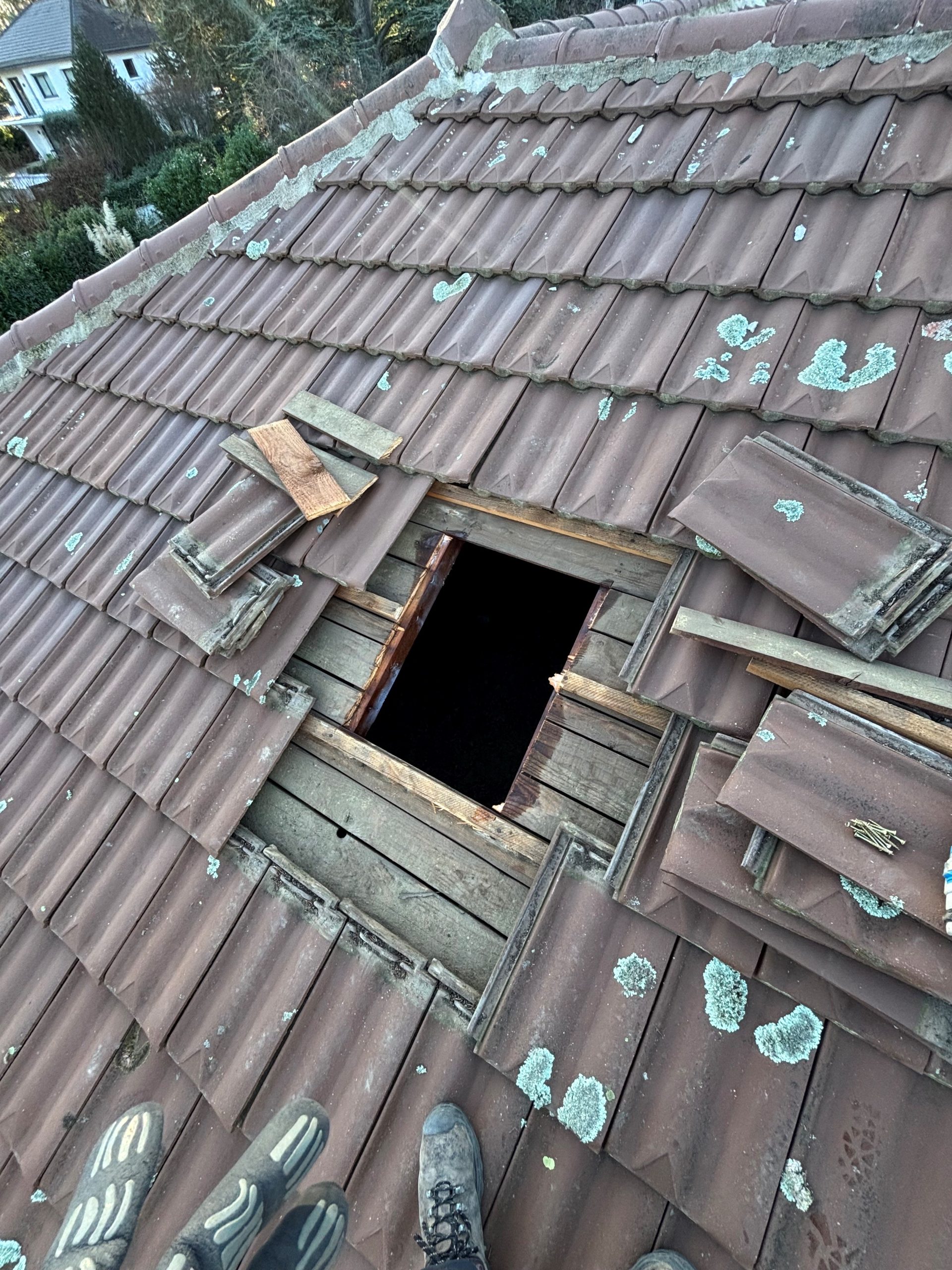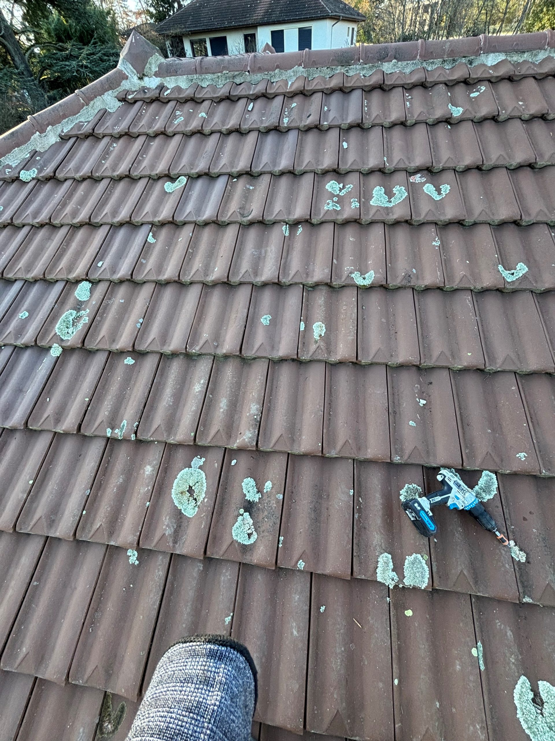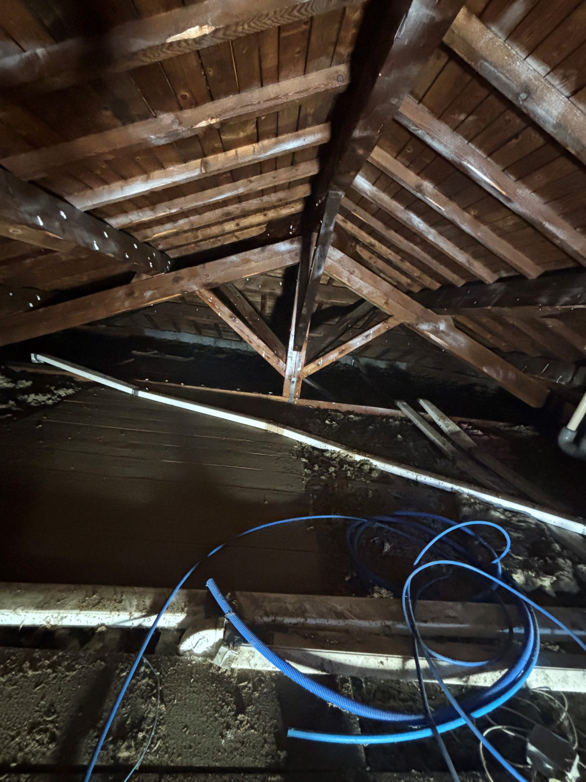 Vos professionnels du traitement de bois ont effectué un trou d'homme sur la toiture pour le passage des tuyaux puis un léger décapage sur les parties de bois les plus infestés, le dépoussiérage, la réinjection (car un traitement avait déjà été effectué des années auparavant) et l'imprégnation totale des pièces de bois au Xilix gel insecticide.